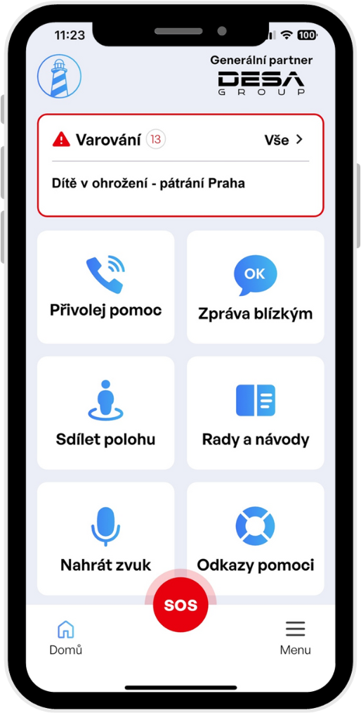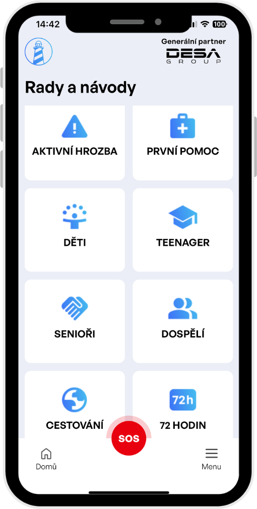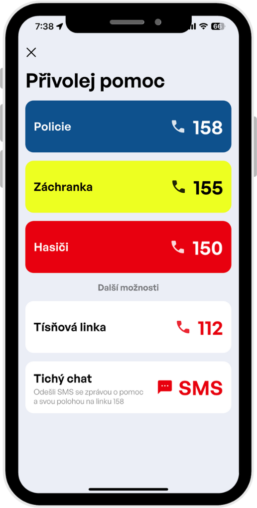 Maják obsahuje rychlou funkci tísňového volání, ve které najdeš všechny hlavní záchranné složky. Policie, Hasiči, Záchranná zdravotnická služba. Když nemůžeš mluvit nahlas, použij funkci Tichý chat pro spojení přímo s linkou 158 Policie pomocí SMS.