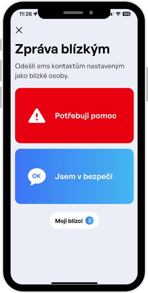 V dalších situacích, kdy nemůžeš z nějakého důvodu mluvit, je tu pro Tebe připravená funkce Zpráva blízkým. Díky této možnosti můžeš poslat na jedno kliknutí zprávu svým blízkým s žádostí o pomoc, nebo s informací, že jsi v pořádku. Zpráva bude automaticky obsahovat Tvé polohové údaje. To se hodí, když zrovna nevíš přesnou adresu místa, kde se nacházíš…